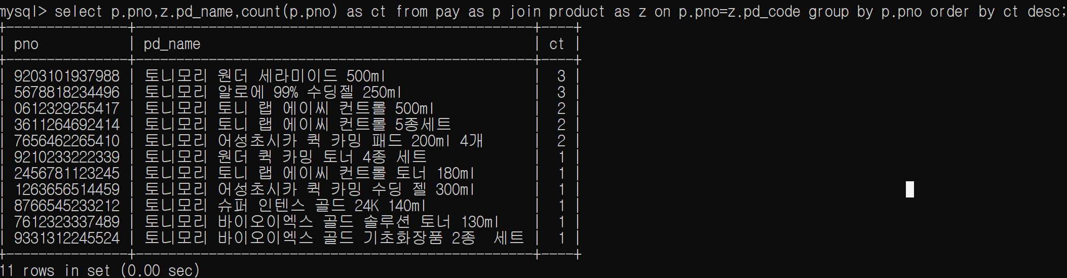 select p.pno,z.pd_name,count(*) from pay as p join product as z on p.pno=z.pd_code group by z.pd_name;