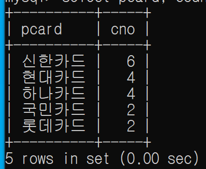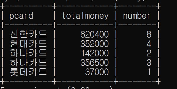 mysql> select pcard, sum(money) as totalmoney, count(*) as number from pay group by parea;