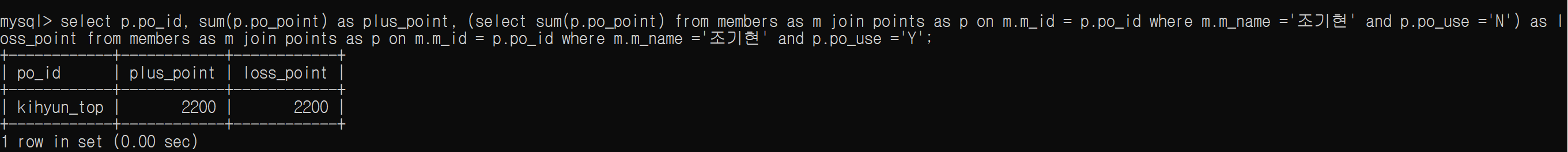 select p.po_id, sum(p.po_point) as plus_point, (select sum(p.po_point) from members as m join points as p on m.m_id = p.po_id where m.m_name ='조기현' and p.po_use ='N') as loss_point from members as m join points as p on m.m_id = p.po_id where m.m_name ='조기현' and p.po_use ='Y';