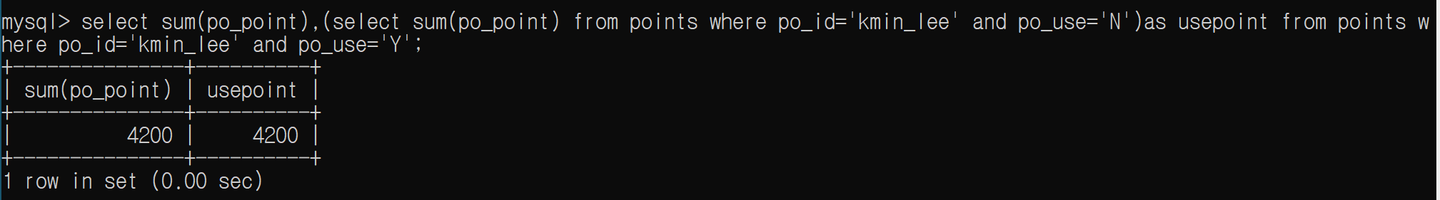 select sum(po_point),(select sum(po_point) from points where po_id='kmin_lee' and po_use='N')as usepoint from points where po_id='kmin_lee' and po_use='Y';